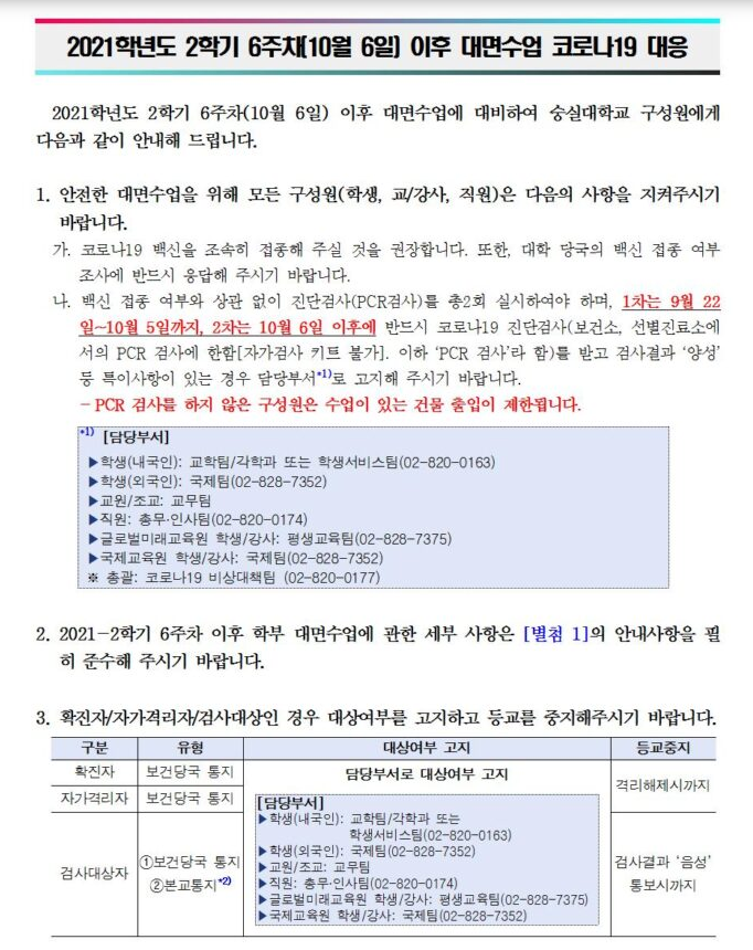 [공지] 10/6(수) 이후 대면수업 코로나19 대응 안내