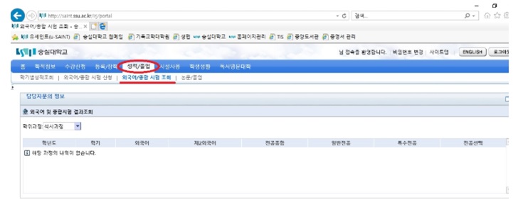 2. 결과 확인방법 : u- SAINT → 성적/졸업 → 외국어/종합 시험 조회 (사진참고)