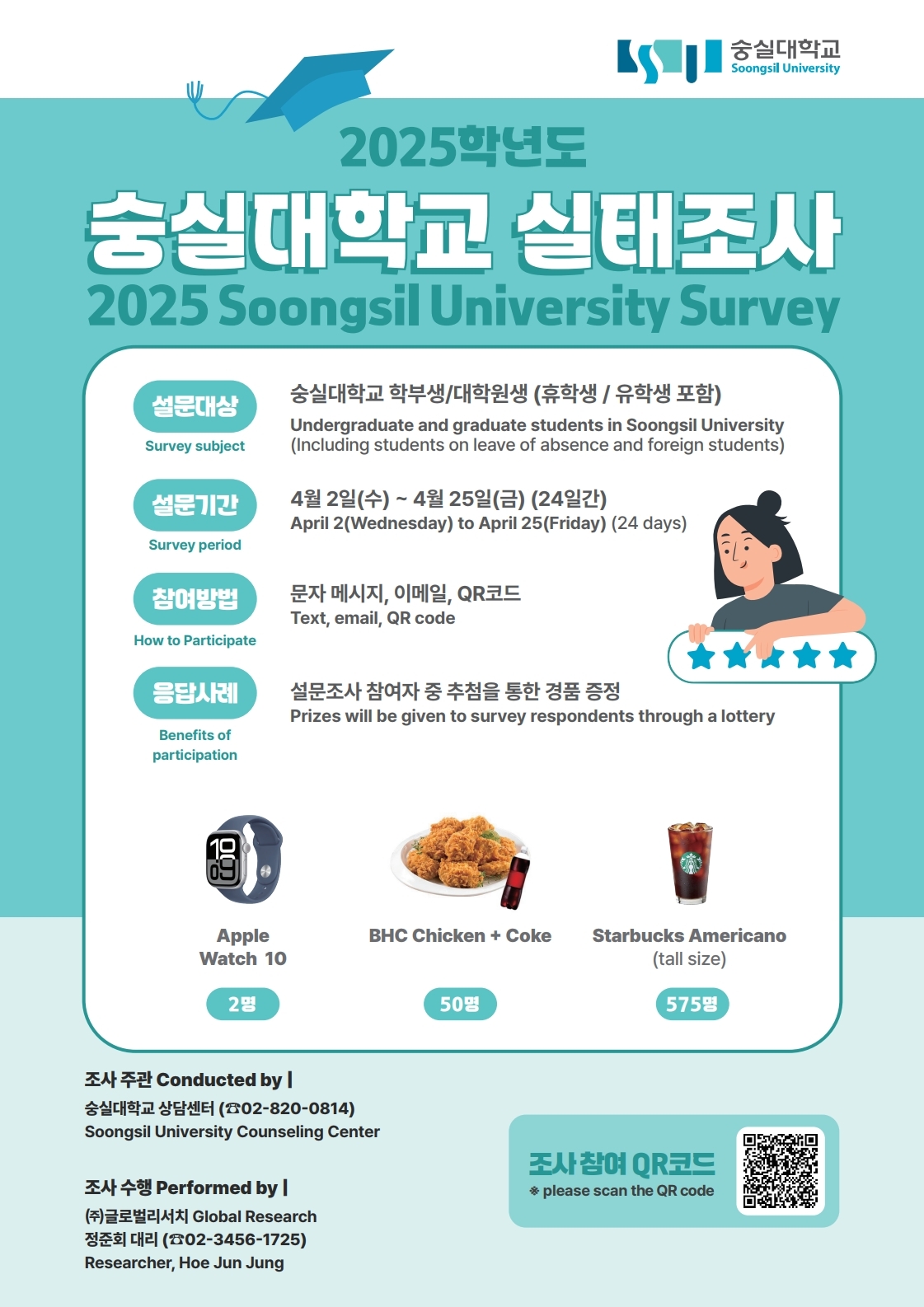 안녕하세요, 중소기업대학원 교학팀입니다. 숭실대학교 상담센터에서 재학생을 대상으로 2025학년도 대학생활 및 정신건강 실태조사를 진행합니다. 설문조사 참여자 중 추첨을 통해 경품을 증정한다고 하니 많은 참여 부탁드립니다.   1. 2025학년도 재학생 대학생활 및 정신건강 실태조사 개요     가. 기간: 2025.04.02.(수) ~ 04.25.(금)     나. 대상: 본교 재학생 (학부생, 대학원생/ 유학생 포함)     다. 방법: 아래 링크에서 설문 조사 진행          https://seolmoon.com/?2855M     라. 내용: 대학생활 및 정신건강에 대한 전반적인 실태 파악     마. 언어: 국문, 영문, 중문, 베트남어